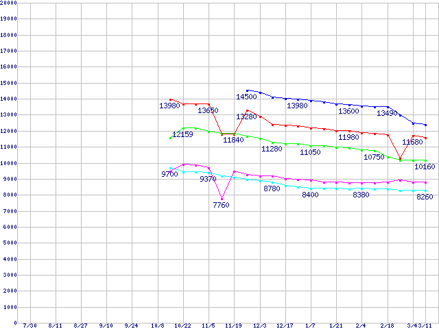 | LGA 775 (FC-LGA42,533MHz,L2 256KB,Prescott,NX bit対応)の最安値推移 | | | (2004年7月30日~2005年3月11日) |