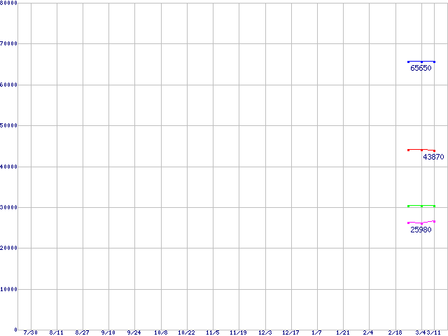 | LGA 775 (FC-LGA4 ,FSB 800MHz,L2 2MB,Hyper-Threading,Prescott,EM64T・EIST・NX bit対応)の最安値推移 | | | (2004年7月30日~2005年3月11日) |