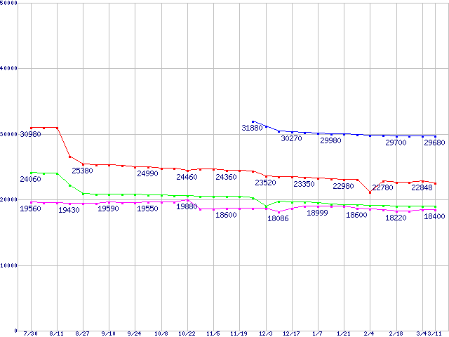 | Socket 478 (FC-PGA2,FSB 800MHz,L2 1MB,Hyper-Threading,Prescott)の最安値推移 | | | (2004年7月30日~2005年3月11日) |