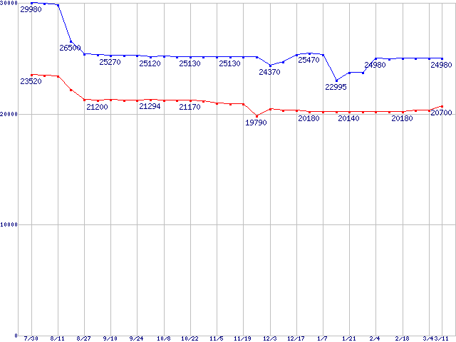 | Socket 478 (FC-PGA2,FSB 800MHz,L2 512KB,Hyper-Threading,Northwood)の最安値推移 | | | (2004年7月30日~2005年3月11日) |