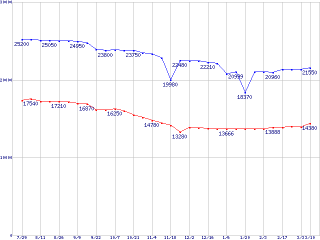 | MaXLine II (5400rpm,Ultra ATA/133,2MB,80GB/Platter,BB)の最安値推移 | | | (2004年7月29日~2005年3月10日) |