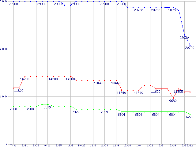 PC3200(DDR400) DDR SDRAM DIMMの最安値推移