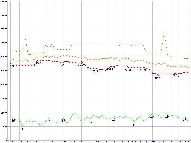 ※このグラフは過去のデータも税率5%相当に調整した税込み相当額のグラフです。 税率変更や、総額表示方式導入(2004年4月)の影響は除いています。 | | | ●凡例 | 最安値 (点線部は販売店未確認 または未調査) | 平均値 | 最高値 | ショップ数 |