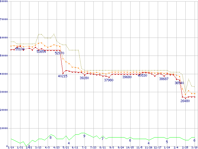 ※このグラフは過去のデータも税率5%相当に調整した税込み相当額のグラフです。 税率変更や、総額表示方式導入(2004年4月)の影響は除いています。 | | | ●凡例 | 最安値 (点線部は販売店未確認 または未調査) | 平均値 | 最高値 | ショップ数 |