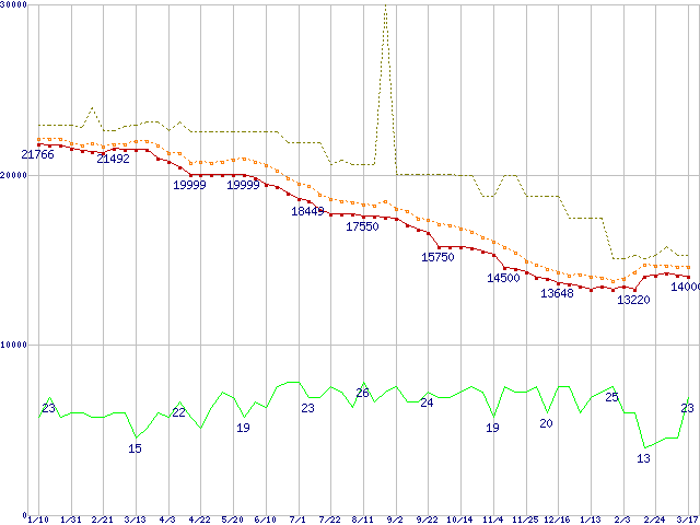 ※このグラフは過去のデータも税率5%相当に調整した税込み相当額のグラフです。 税率変更や、総額表示方式導入(2004年4月)の影響は除いています。 | | | ●凡例 | 最安値 (点線部は販売店未確認 または未調査) | 平均値 | 最高値 | ショップ数 |