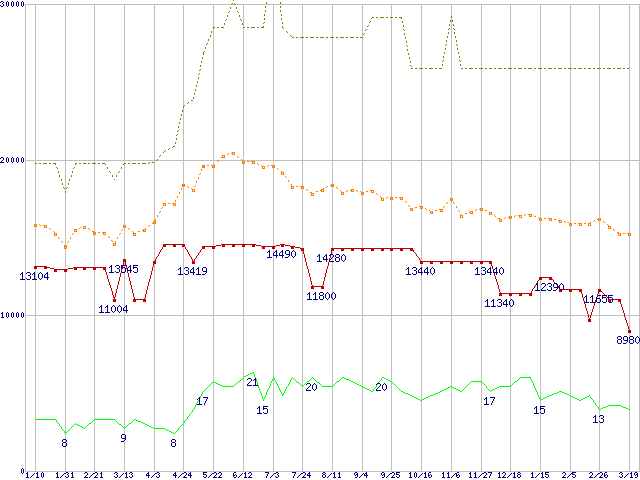 PC3200(DDR400) DDR SDRAM DIMM ECC対応 Registeredタイプの最安値推移