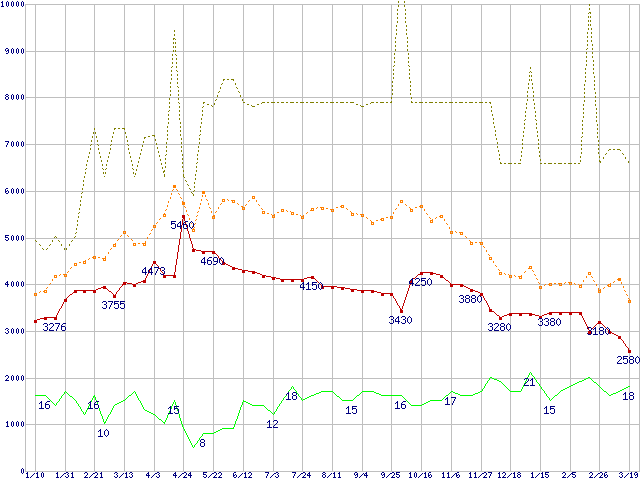 PC3200(DDR400) DDR SDRAM DIMMの最安値推移
