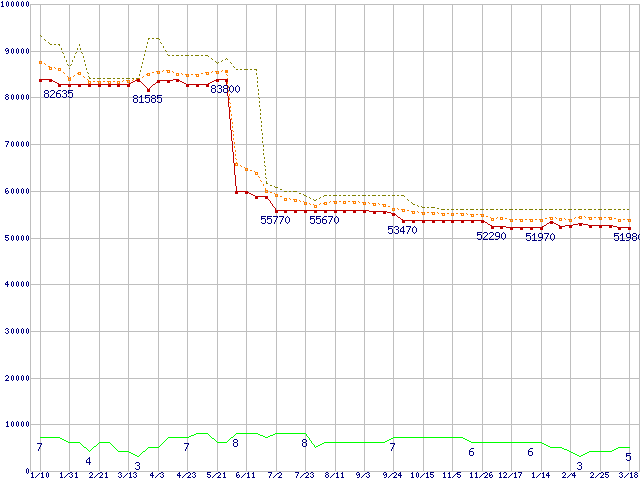 ※このグラフは過去のデータも税率5%相当に調整した税込み相当額のグラフです。 税率変更や、総額表示方式導入(2004年4月)の影響は除いています。 | | | ●凡例 | 最安値 (点線部は販売店未確認 または未調査) | 平均値 | 最高値 | ショップ数 |