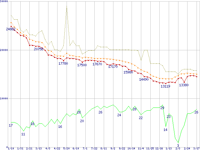 | Deskstar 7K250 HDS722525VLAT80 (250GB,8MB)の価格推移 | | | (2004年1月10日~2005年3月17日) |