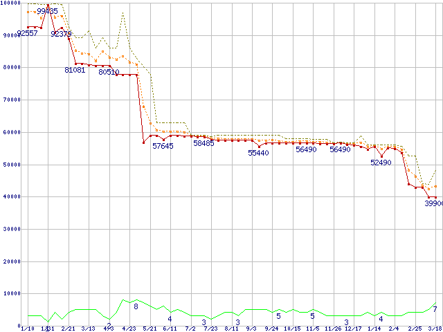 ※このグラフは過去のデータも税率5%相当に調整した税込み相当額のグラフです。 税率変更や、総額表示方式導入(2004年4月)の影響は除いています。 | | | ●凡例 | 最安値 (点線部は販売店未確認 または未調査) | 平均値 | 最高値 | ショップ数 |