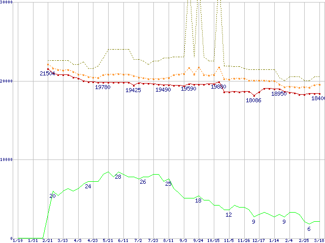 ※このグラフは過去のデータも税率5%相当に調整した税込み相当額のグラフです。 税率変更や、総額表示方式導入(2004年4月)の影響は除いています。 | | | ●凡例 | 最安値 (点線部は販売店未確認 または未調査) | 平均値 | 最高値 | ショップ数 |
