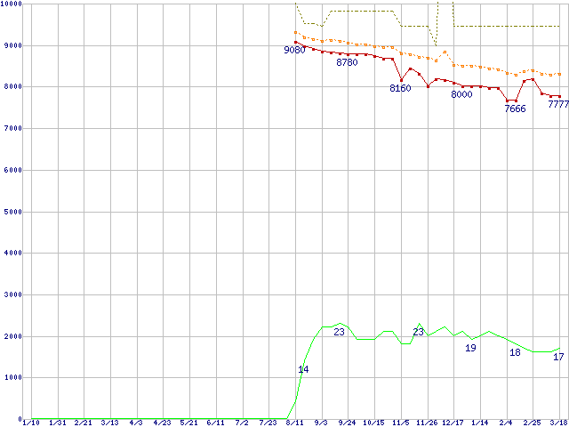 | Sempron 2500+(1.75GHz,L2 256KB,Socket A) リテールパッケージの価格推移 | | | (2004年1月10日~2005年3月18日) |