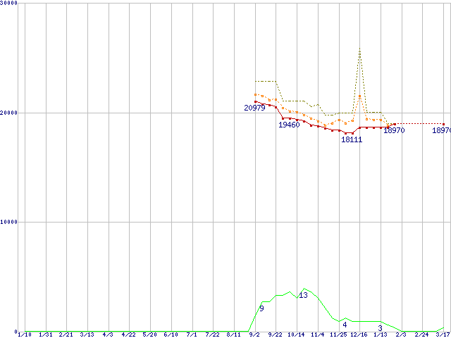 ※このグラフは過去のデータも税率5%相当に調整した税込み相当額のグラフです。 税率変更や、総額表示方式導入(2004年4月)の影響は除いています。 | | | ●凡例 | 最安値 (点線部は販売店未確認 または未調査) | 平均値 | 最高値 | ショップ数 |