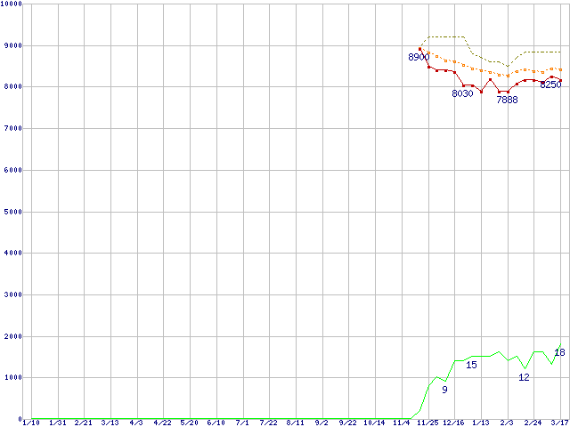 ※このグラフは過去のデータも税率5%相当に調整した税込み相当額のグラフです。 税率変更や、総額表示方式導入(2004年4月)の影響は除いています。 | | | ●凡例 | 最安値 (点線部は販売店未確認 または未調査) | 平均値 | 最高値 | ショップ数 |