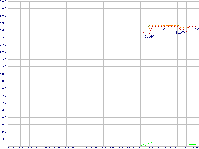 ※このグラフは過去のデータも税率5%相当に調整した税込み相当額のグラフです。 税率変更や、総額表示方式導入(2004年4月)の影響は除いています。 | | | ●凡例 | 最安値 (点線部は販売店未確認 または未調査) | 平均値 | 最高値 | ショップ数 |