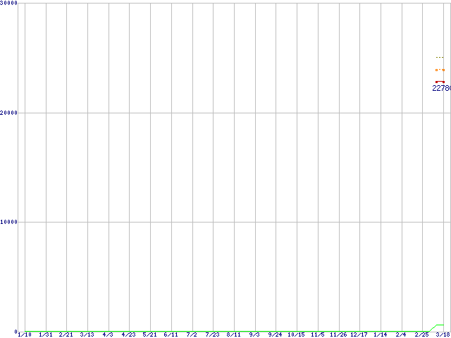※このグラフは過去のデータも税率5%相当に調整した税込み相当額のグラフです。 税率変更や、総額表示方式導入(2004年4月)の影響は除いています。 | | | ●凡例 | 最安値 (点線部は販売店未確認 または未調査) | 平均値 | 最高値 | ショップ数 |
