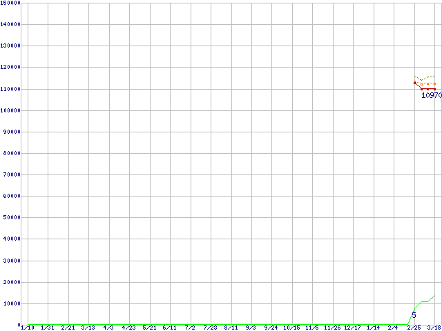 ※このグラフは過去のデータも税率5%相当に調整した税込み相当額のグラフです。 税率変更や、総額表示方式導入(2004年4月)の影響は除いています。 | | | ●凡例 | 最安値 (点線部は販売店未確認 または未調査) | 平均値 | 最高値 | ショップ数 |