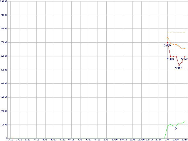 ※このグラフは過去のデータも税率5%相当に調整した税込み相当額のグラフです。 税率変更や、総額表示方式導入(2004年4月)の影響は除いています。 | | | ●凡例 | 最安値 (点線部は販売店未確認 または未調査) | 平均値 | 最高値 | ショップ数 |