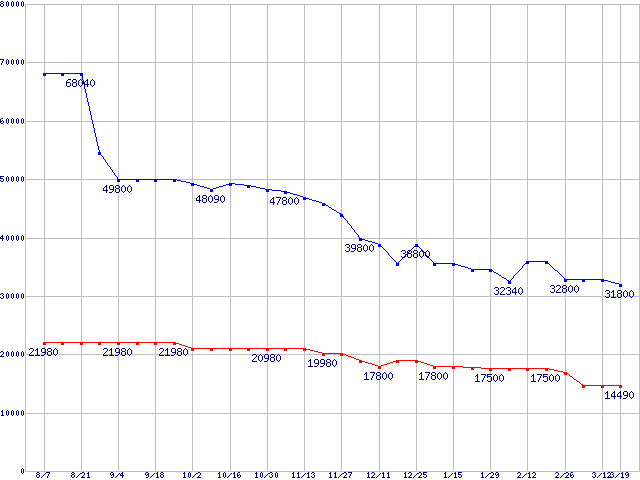 | PC2 3200(DDR2 400) DDR2 SDRAM DIMM ECC対応 Registeredタイプの最安値推移 | | | (2004年8月7日~2005年3月19日) |