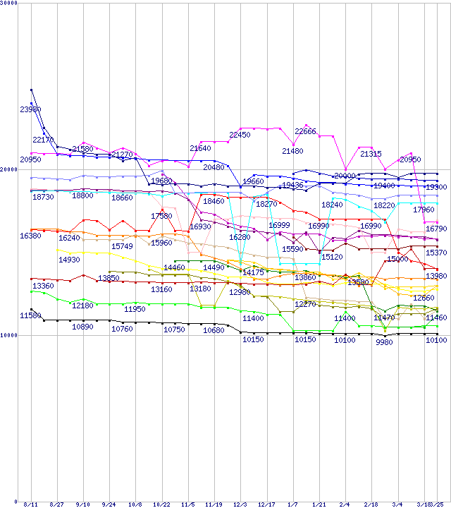 | CPU主要製品(最安値1万円~2万円未満)の最安値推移 | | | (2004年8月11日~2005年3月25日) |