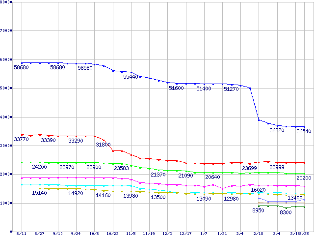 | Socket 754・FSB 800MHzの最安値推移 | | | (2004年8月11日~2005年3月25日) |