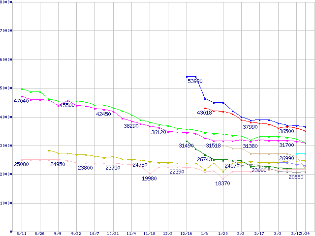 HDD主要製品(最安値1万5千円~2万円未満)の最安値推移