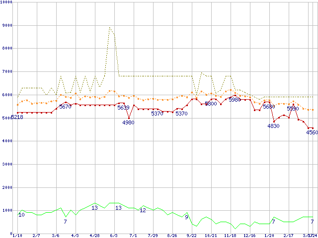 ※このグラフは過去のデータも税率5%相当に調整した税込み相当額のグラフです。 税率変更や、総額表示方式導入(2004年4月)の影響は除いています。 | | | ●凡例 | 最安値 (点線部は販売店未確認 または未調査) | 平均値 | 最高値 | ショップ数 |