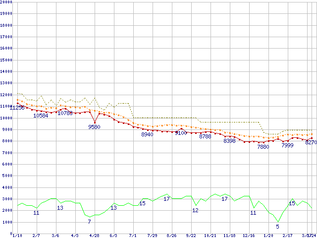 ※このグラフは過去のデータも税率5%相当に調整した税込み相当額のグラフです。 税率変更や、総額表示方式導入(2004年4月)の影響は除いています。 | | | ●凡例 | 最安値 (点線部は販売店未確認 または未調査) | 平均値 | 最高値 | ショップ数 |