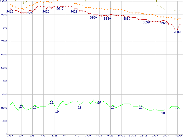 ※このグラフは過去のデータも税率5%相当に調整した税込み相当額のグラフです。 税率変更や、総額表示方式導入(2004年4月)の影響は除いています。 | | | ●凡例 | 最安値 (点線部は販売店未確認 または未調査) | 平均値 | 最高値 | ショップ数 |