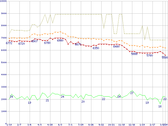 ※このグラフは過去のデータも税率5%相当に調整した税込み相当額のグラフです。 税率変更や、総額表示方式導入(2004年4月)の影響は除いています。 | | | ●凡例 | 最安値 (点線部は販売店未確認 または未調査) | 平均値 | 最高値 | ショップ数 |