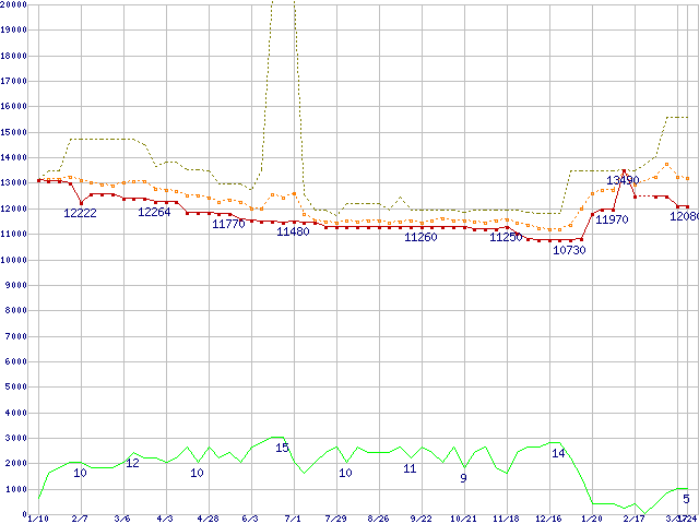 ※このグラフは過去のデータも税率5%相当に調整した税込み相当額のグラフです。 税率変更や、総額表示方式導入(2004年4月)の影響は除いています。 | | | ●凡例 | 最安値 (点線部は販売店未確認 または未調査) | 平均値 | 最高値 | ショップ数 |