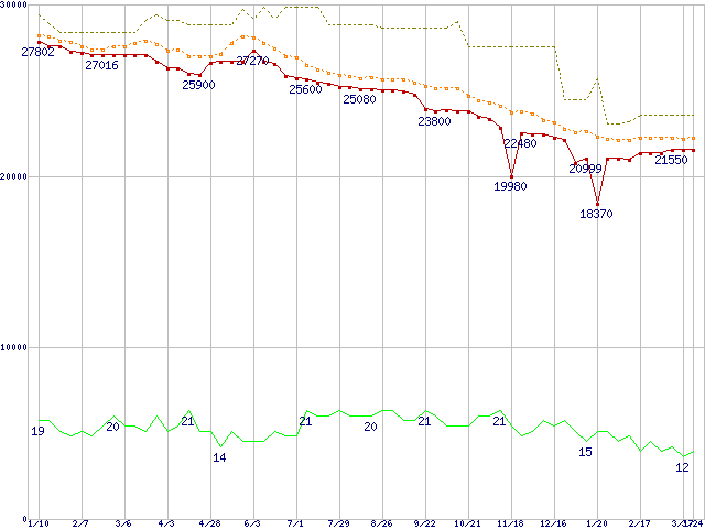 ※このグラフは過去のデータも税率5%相当に調整した税込み相当額のグラフです。 税率変更や、総額表示方式導入(2004年4月)の影響は除いています。 | | | ●凡例 | 最安値 (点線部は販売店未確認 または未調査) | 平均値 | 最高値 | ショップ数 |