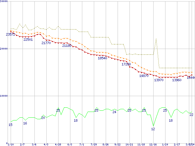 ※このグラフは過去のデータも税率5%相当に調整した税込み相当額のグラフです。 税率変更や、総額表示方式導入(2004年4月)の影響は除いています。 | | | ●凡例 | 最安値 (点線部は販売店未確認 または未調査) | 平均値 | 最高値 | ショップ数 |