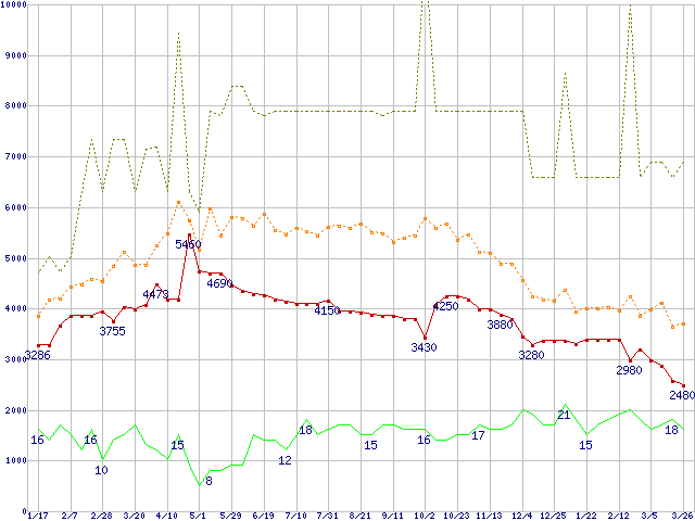 PC3200(DDR400) DDR SDRAM DIMMの最安値推移