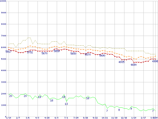 ※このグラフは過去のデータも税率5%相当に調整した税込み相当額のグラフです。 税率変更や、総額表示方式導入(2004年4月)の影響は除いています。 | | | ●凡例 | 最安値 (点線部は販売店未確認 または未調査) | 平均値 | 最高値 | ショップ数 |