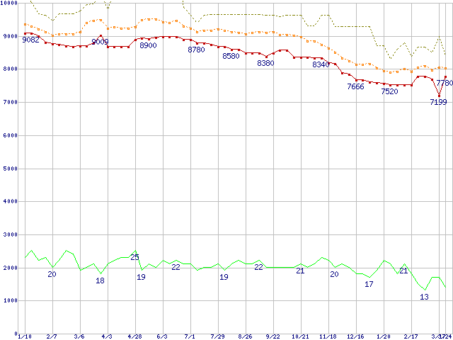 ※このグラフは過去のデータも税率5%相当に調整した税込み相当額のグラフです。 税率変更や、総額表示方式導入(2004年4月)の影響は除いています。 | | | ●凡例 | 最安値 (点線部は販売店未確認 または未調査) | 平均値 | 最高値 | ショップ数 |