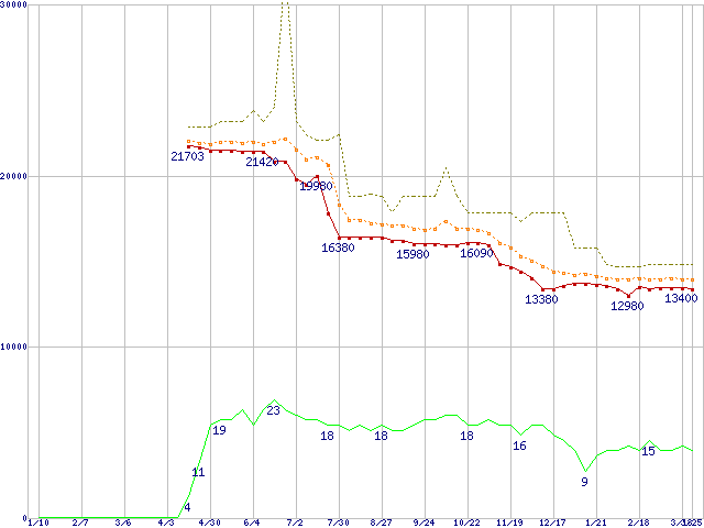 ※このグラフは過去のデータも税率5%相当に調整した税込み相当額のグラフです。 税率変更や、総額表示方式導入(2004年4月)の影響は除いています。 | | | ●凡例 | 最安値 (点線部は販売店未確認 または未調査) | 平均値 | 最高値 | ショップ数 |