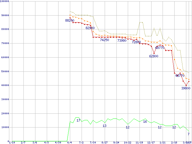※このグラフは過去のデータも税率5%相当に調整した税込み相当額のグラフです。 税率変更や、総額表示方式導入(2004年4月)の影響は除いています。 | | | ●凡例 | 最安値 (点線部は販売店未確認 または未調査) | 平均値 | 最高値 | ショップ数 |