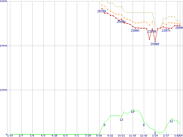 ※このグラフは過去のデータも税率5%相当に調整した税込み相当額のグラフです。 税率変更や、総額表示方式導入(2004年4月)の影響は除いています。 | | | ●凡例 | 最安値 (点線部は販売店未確認 または未調査) | 平均値 | 最高値 | ショップ数 |