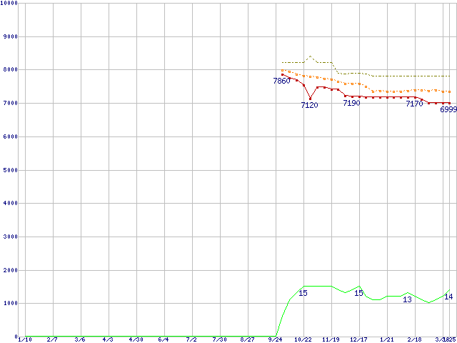 ※このグラフは過去のデータも税率5%相当に調整した税込み相当額のグラフです。 税率変更や、総額表示方式導入(2004年4月)の影響は除いています。 | | | ●凡例 | 最安値 (点線部は販売店未確認 または未調査) | 平均値 | 最高値 | ショップ数 |