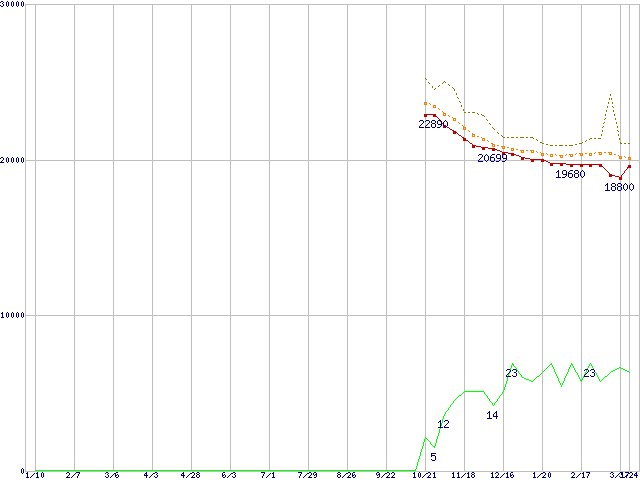 ※このグラフは過去のデータも税率5%相当に調整した税込み相当額のグラフです。 税率変更や、総額表示方式導入(2004年4月)の影響は除いています。 | | | ●凡例 | 最安値 (点線部は販売店未確認 または未調査) | 平均値 | 最高値 | ショップ数 |