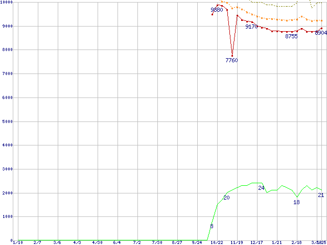 ※このグラフは過去のデータも税率5%相当に調整した税込み相当額のグラフです。 税率変更や、総額表示方式導入(2004年4月)の影響は除いています。 | | | ●凡例 | 最安値 (点線部は販売店未確認 または未調査) | 平均値 | 最高値 | ショップ数 |