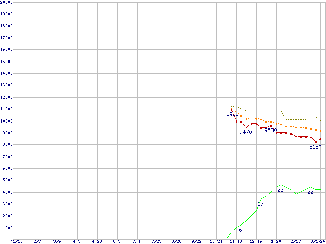 ※このグラフは過去のデータも税率5%相当に調整した税込み相当額のグラフです。 税率変更や、総額表示方式導入(2004年4月)の影響は除いています。 | | | ●凡例 | 最安値 (点線部は販売店未確認 または未調査) | 平均値 | 最高値 | ショップ数 |