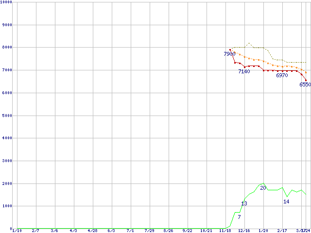 ※このグラフは過去のデータも税率5%相当に調整した税込み相当額のグラフです。 税率変更や、総額表示方式導入(2004年4月)の影響は除いています。 | | | ●凡例 | 最安値 (点線部は販売店未確認 または未調査) | 平均値 | 最高値 | ショップ数 |