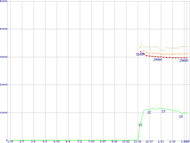 ※このグラフは過去のデータも税率5%相当に調整した税込み相当額のグラフです。 税率変更や、総額表示方式導入(2004年4月)の影響は除いています。 | | | ●凡例 | 最安値 (点線部は販売店未確認 または未調査) | 平均値 | 最高値 | ショップ数 |