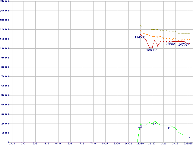 ※このグラフは過去のデータも税率5%相当に調整した税込み相当額のグラフです。 税率変更や、総額表示方式導入(2004年4月)の影響は除いています。 | | | ●凡例 | 最安値 (点線部は販売店未確認 または未調査) | 平均値 | 最高値 | ショップ数 |