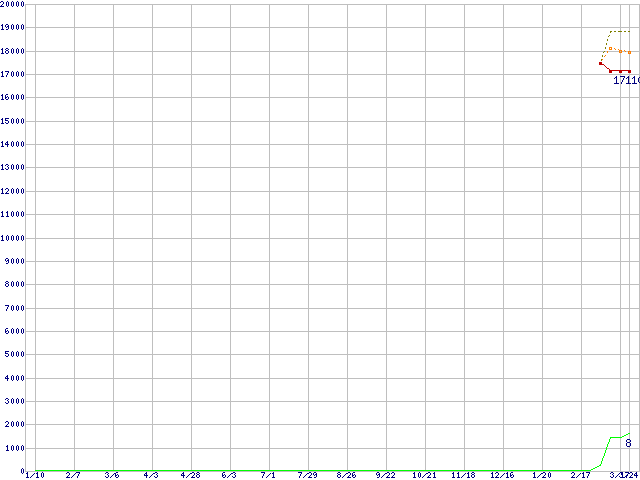 ※このグラフは過去のデータも税率5%相当に調整した税込み相当額のグラフです。 税率変更や、総額表示方式導入(2004年4月)の影響は除いています。 | | | ●凡例 | 最安値 (点線部は販売店未確認 または未調査) | 平均値 | 最高値 | ショップ数 |
