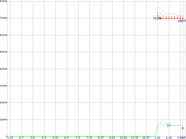 ※このグラフは過去のデータも税率5%相当に調整した税込み相当額のグラフです。 税率変更や、総額表示方式導入(2004年4月)の影響は除いています。 | | | ●凡例 | 最安値 (点線部は販売店未確認 または未調査) | 平均値 | 最高値 | ショップ数 |