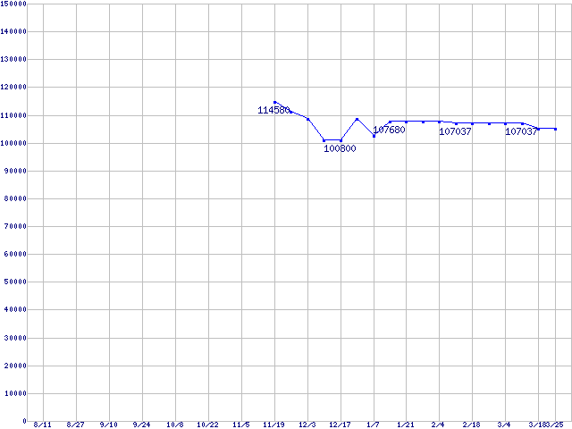 | LGA 775 (FC-LGA4,FSB 1066MHz,L2 512KB,L3 2MB,Hyper-Threading,Gallatin)の最安値推移 | | | (2004年8月11日~2005年3月25日) |