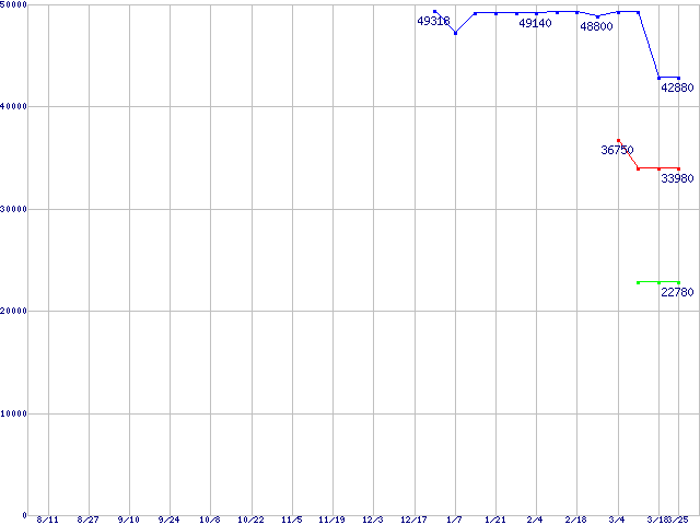 | LGA 775 (FC-LGA4 ,FSB 800MHz,L2 1MB,Hyper-Threading,Prescott,NX bit対応,BTX対応)の最安値推移 | | | (2004年8月11日~2005年3月25日) |